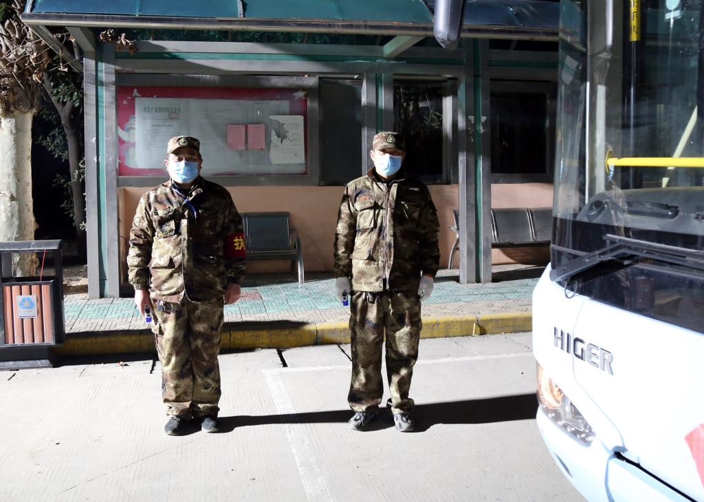 上圖2月2日凌晨5:20,為曹輝(左一)和隊員在通勤車前,等待為職工測量體溫