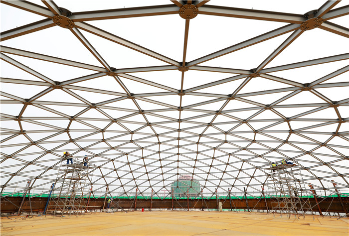 碳鑫科技公司20000立方米的乙醇成品罐,正進(jìn)行罐頂部網(wǎng)殼拼裝。王明明攝
