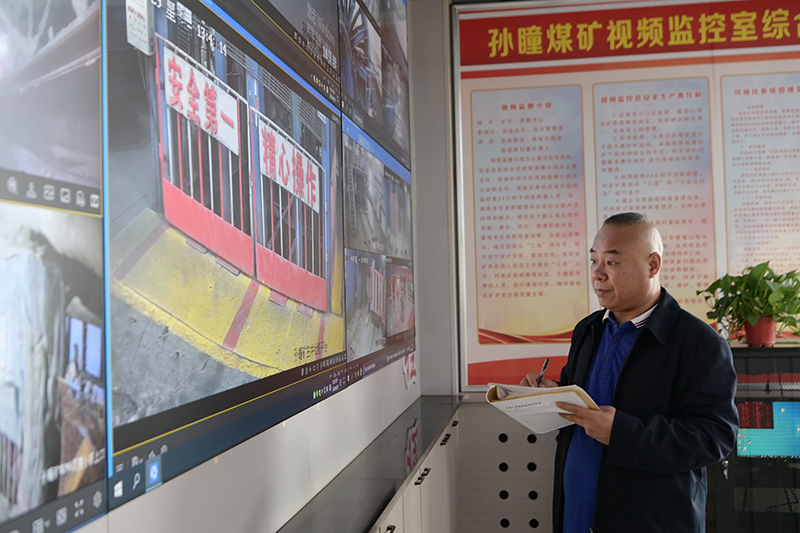 在該礦視頻監(jiān)控室,面對(duì)6塊監(jiān)視大屏的24個(gè)作業(yè)點(diǎn),安監(jiān)員王建兩眼來(lái)回逡巡,緊盯屏幕,認(rèn)真觀察每一個(gè)作業(yè)場(chǎng)所的規(guī)范作業(yè)情況,時(shí)而在隱患登記簿上記錄,時(shí)而拿起電話(huà)聯(lián)系,為礦井守好安全生產(chǎn)的第一道關(guān)口忙得不亦樂(lè)乎。