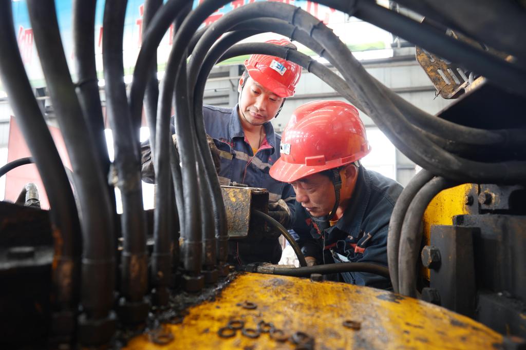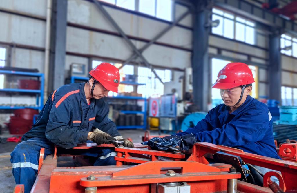 圖為該礦機(jī)電科(機(jī)廠)職工陳興開(kāi)、徐輝正在維修井下挖掘機(jī)。