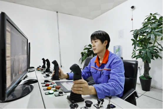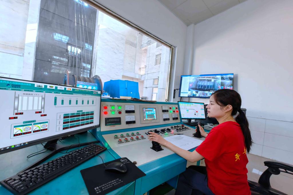圖為保運(yùn)區(qū)絞車(chē)司機(jī)董平正在操作運(yùn)行主井絞車(chē)