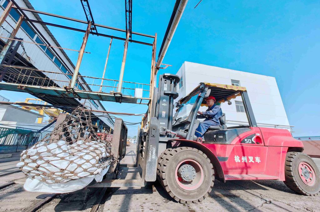 圖為運(yùn)輸區(qū)叉車(chē)司機(jī)張振正在叉運(yùn)物料