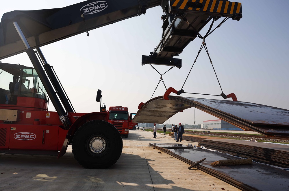 10月11日上午,淮北零碳智慧物流產(chǎn)業(yè)園大宗物資作業(yè)現(xiàn)場,正面吊運(yùn)起重機(jī)正開足馬力,將600噸16至25毫米厚度的大塊鋼板一次性吊起6至8塊,裝到排成長隊的6軸大貨車上。