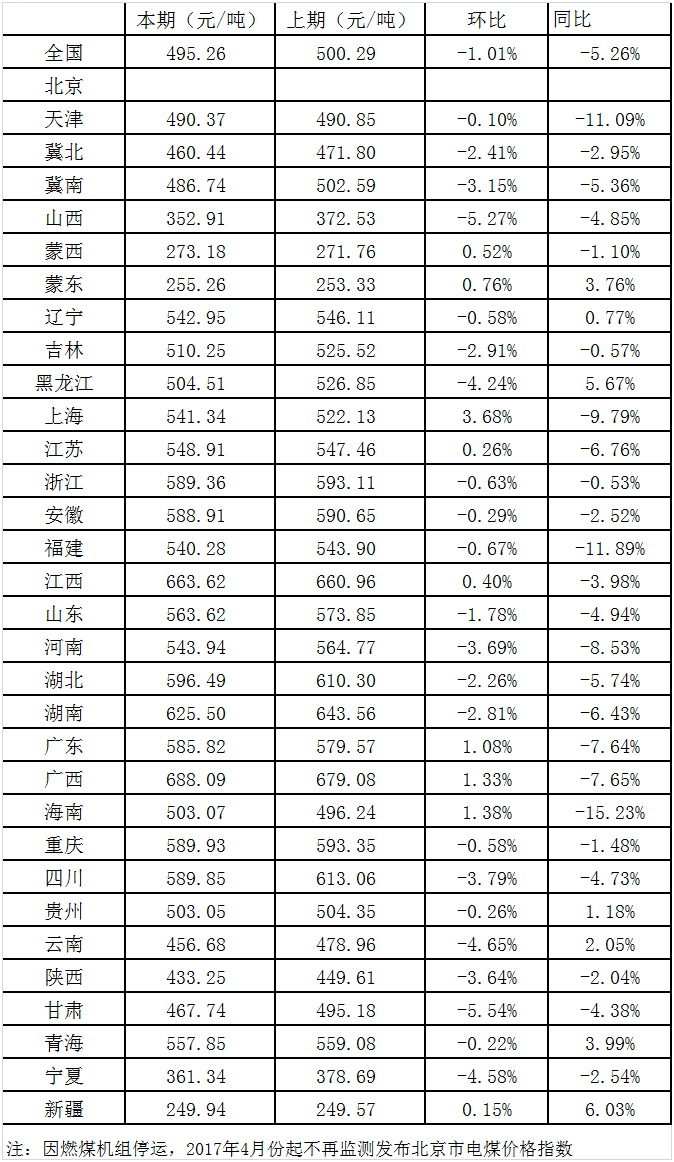2019年5月15日,國家發(fā)展改革委價(jià)格監(jiān)測(cè)中心公布4月中國電煤價(jià)格指數(shù)為495.26元/噸,環(huán)比下行1.01%,同比下降5.26%。其中,監(jiān)測(cè)的31個(gè)省市(不含北京市)中,價(jià)格下行地區(qū)數(shù)量有22個(gè),下行幅度減弱至27.44元/噸以內(nèi);其他9個(gè)地區(qū)電煤價(jià)格全部上行,漲幅上行至19.21元/噸以內(nèi)。本月全國煤炭價(jià)格活動(dòng)范圍整體上移,且煤炭價(jià)格上下行地區(qū)數(shù)量比例基本維持,說明價(jià)格下行區(qū)域活力減弱,而上行幅度擴(kuò)大。