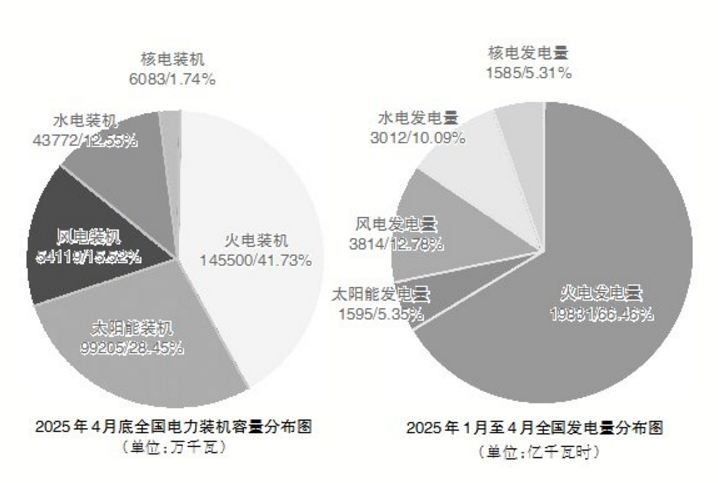 截至今年4月底,全國電力裝機容量達到34.9億千瓦,其中火電裝機容量占比下降至41.73%,水電、風電、太陽能發電裝機容量達到19.7億千瓦、占比達到56.53%。從發電量分布看,今年前4個月,全國規模以上累計發電量2.98萬億千瓦時,其中火電發電量1.98萬億千瓦時,占66.46%;水電、風電和太陽能總發電量8421億千瓦時,占28.22%。非化石能源對傳統能源的替代作用越來越突出。但也必須看到,火電特別是燃煤發電仍然是全國的主力電源和支撐性電源。
